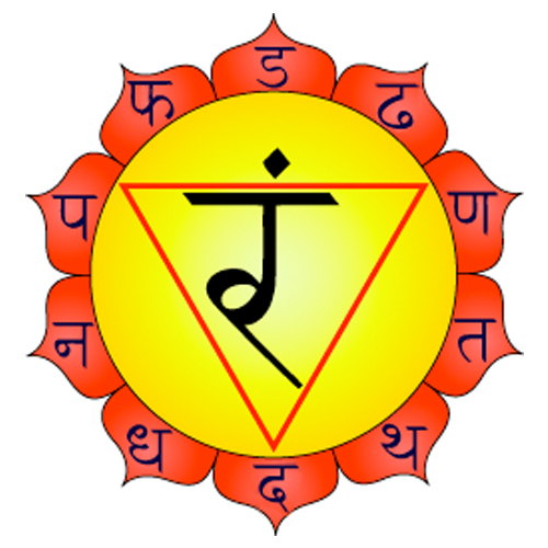 Manipura chakra has been illustrated as a lotus with ten bright yellow colored petals. It has an upward reddish triangle in the center where the “Agni” or the fire resides encompassing a phallic structure representing Shiva. The root syllable related to this chakra is “Ram”.