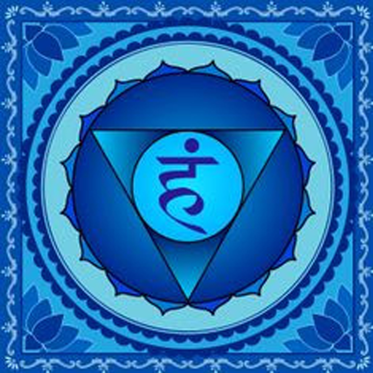Anahata chakra has been portrayed as a lotus with twelve aquamarine colored petals. The shape of its center matches a six pointed star. The downward triangle represents the cosmic energy pouring down and the upward triangle symbolizes the spiritual aspiration. It is a two-dimensional form of the Kabbalistic Merkaba or David’s star. The root syllable related to this chakra is “Yam”.